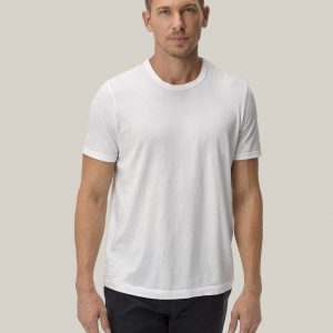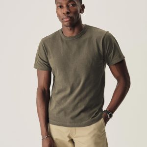 Classic fit short sleeve sweater tee with a straight hem. Yarn-dyed 16 gauge cotton jersey features light slub texture. Features double layer 1×1 ribbing at the collar and rib finishing at the cuffs and hem. Constructed with hand-linked seams for improved durability.