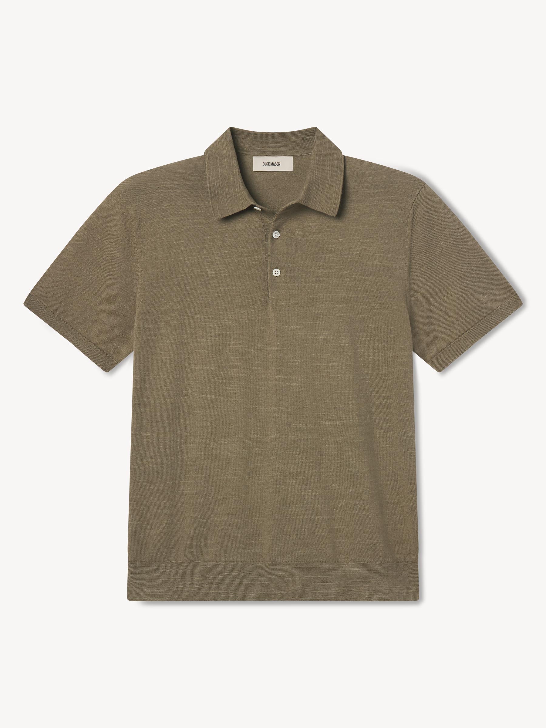 Classic fit sweater polo in yarn-dyed 16 gauge cotton jersey with light slub texture. Features a three-button closure and rib finishing at the cuffs and hem. Constructed with hand-linked seams for improved durability.