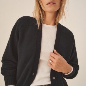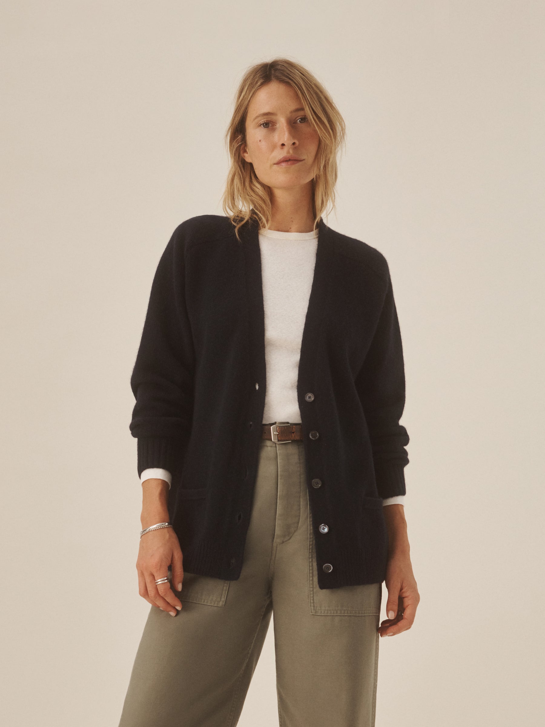Inspired by vintage “grandfather” cardigans, a sweater made from 100% cashmere in a soft jersey stitch with natural drape and structure. Designed with an oversized fit and saddle armholes, it’s finished with rib trims at the cuffs and hem, functional buttons at the center front, and cleanly finished pockets.