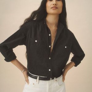 Inspired by 1950s men’s dress shirts, an Oxford cut from a natural, yarn-dyed fiber blend with a soft hand and crisp structure. Our slimmest shirt yet, it’s designed with a button-down collar that holds the perfect roll, stacked mother-of-pearl buttons, and felled seams for durability. Details include knife pleats at the cuff, a box pleat at the back yoke, and a shrunken silhouette made to layer under a blazer or wear solo.