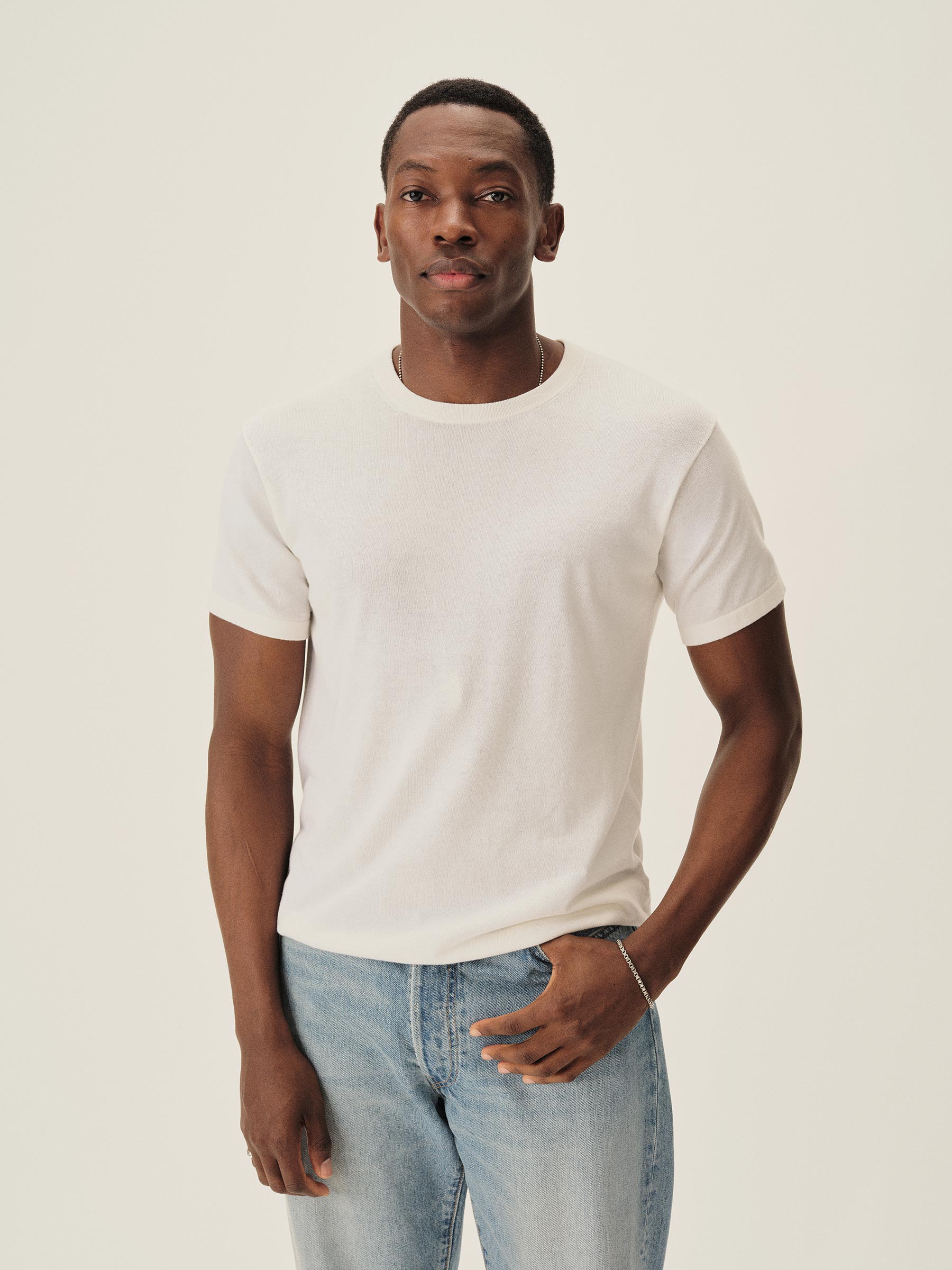 A fully fashioned tee that draws inspiration from the lifestyle surrounding Lake Como in the 1960s. Knit from an ultrafine blend of yarn-dyed organic Egyptian cotton and cashmere, spun in Italy. Featuring tubular finishes at the cuffs and bottom hem, and a shallow sleeve cap.