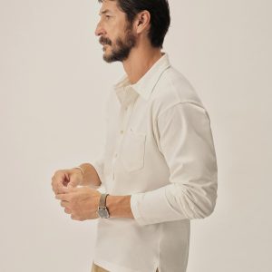 A popover shirt made from a midweight compact cotton jersey with a smooth, uniform texture and cool hand. It features a traditional shirt collar with a four-button half placket and single chest pocket. Ribbed sleeve cuffs.
