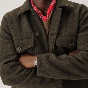 Classic fit field shirt in 340 GSM felted merino wool, twice boiled for improved insulation and durability. Details include patch-and-flap chest pockets and a button front closure. Constructed with hand-sewn facings and cover-stitching with flat seams for comfort.