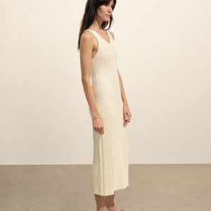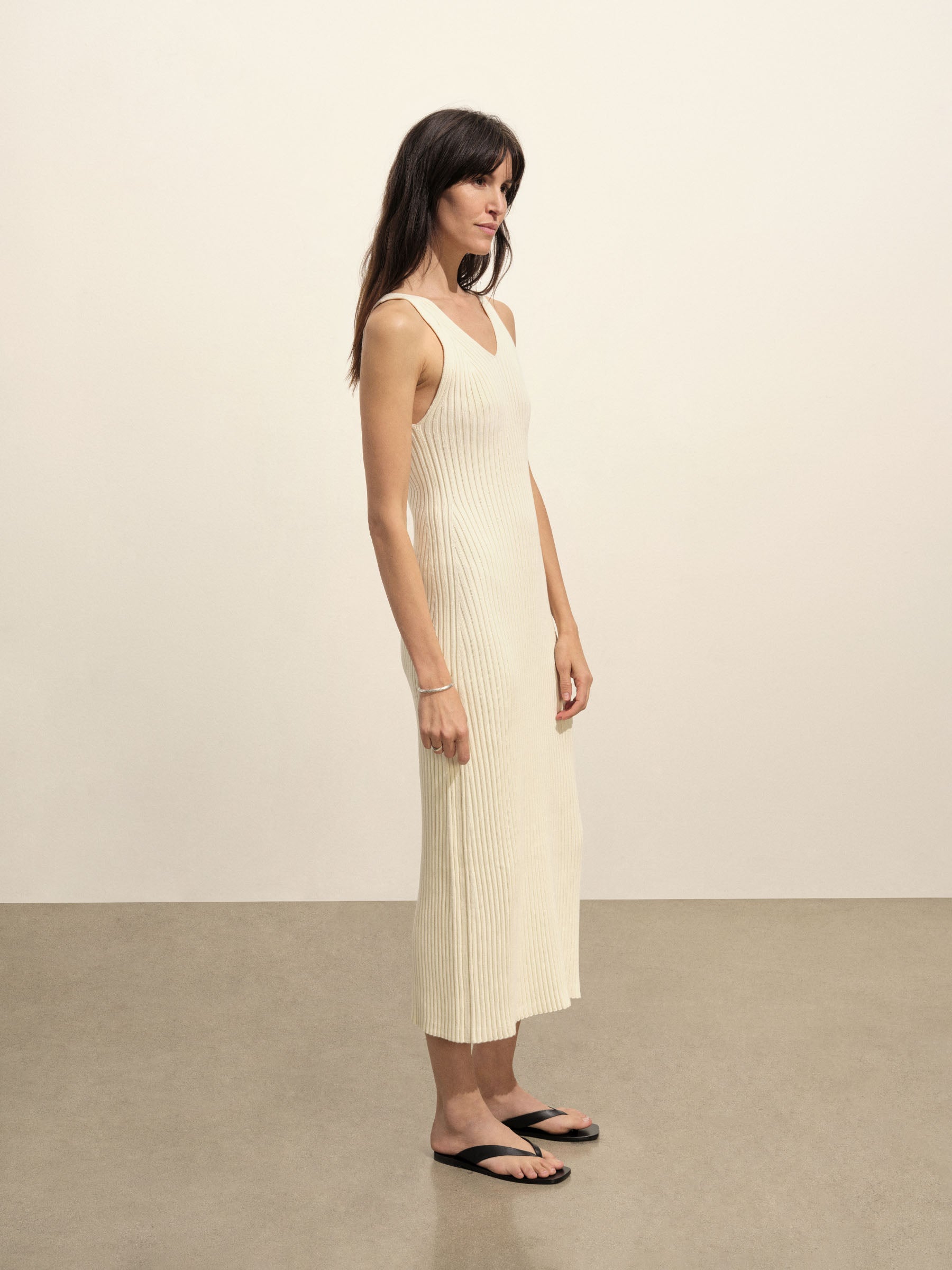 Slim-fit, vintage-inspired, 51” V-neck tank dress crafted from 100% Italian cotton yarn with a 3×3 deep rib structure. Designed with concealed chain threads and snaps beneath each shoulder to keep bra straps in place. Garment washed for a truly vintage, broken-in feel.