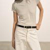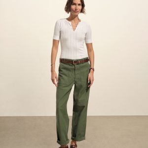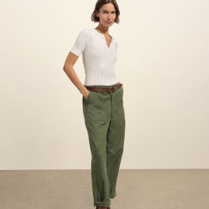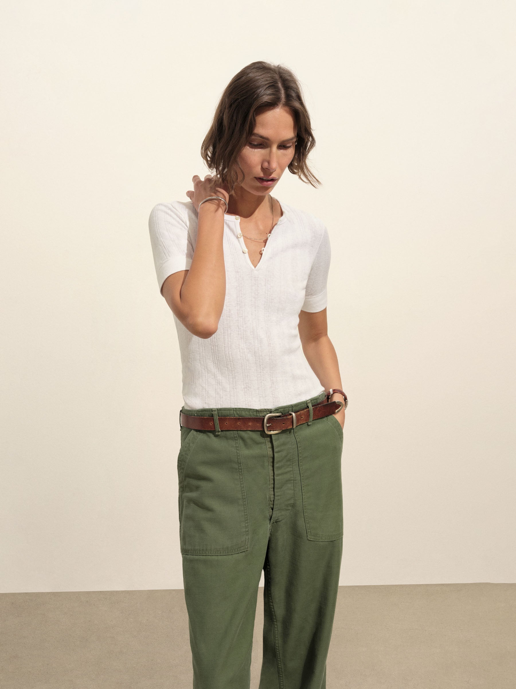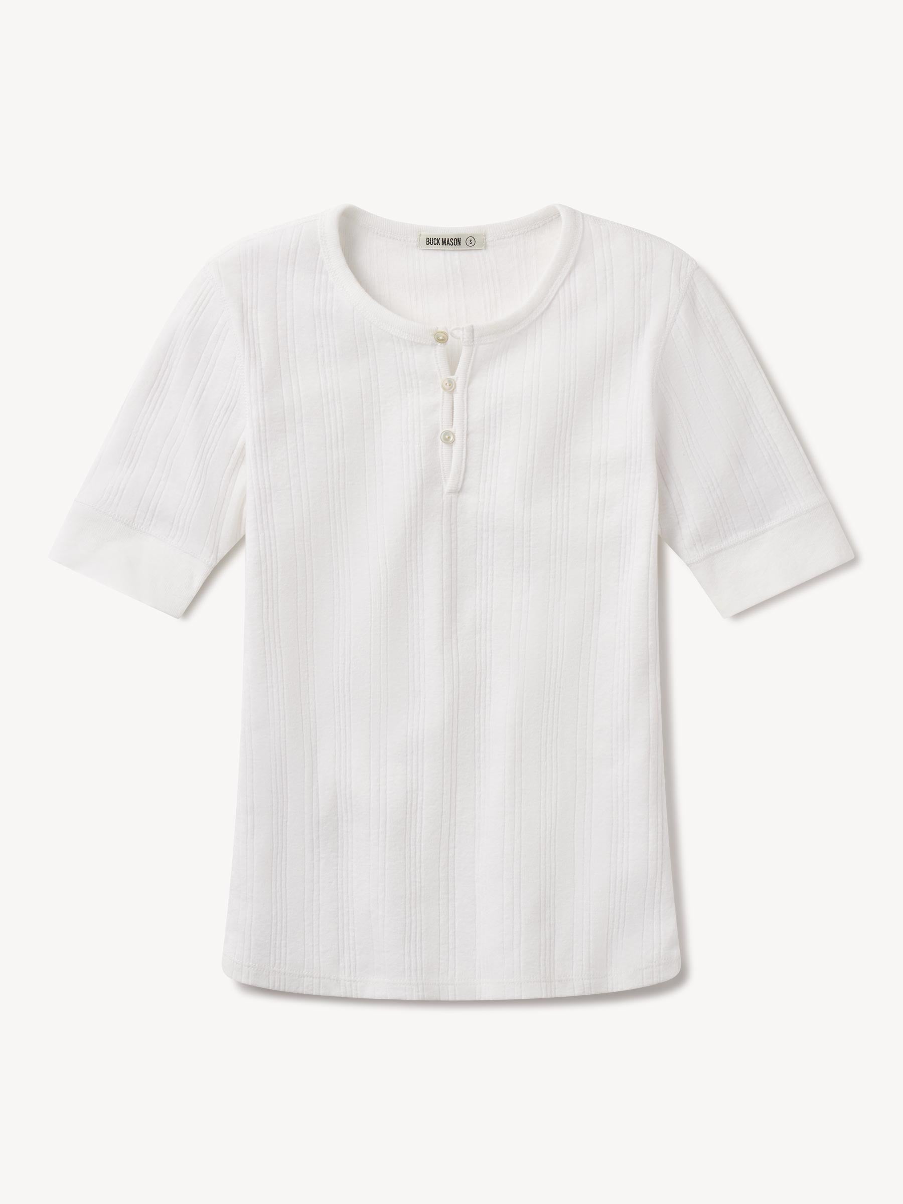 Military-inspired short sleeve henley, crafted from a superfine blend of new and recycled cotton with a subtle, textured rib. Featuring a three-button loop placket and sleeve cuffs. Finished with mother of pearl buttons and garment washed for a lived-in feel.