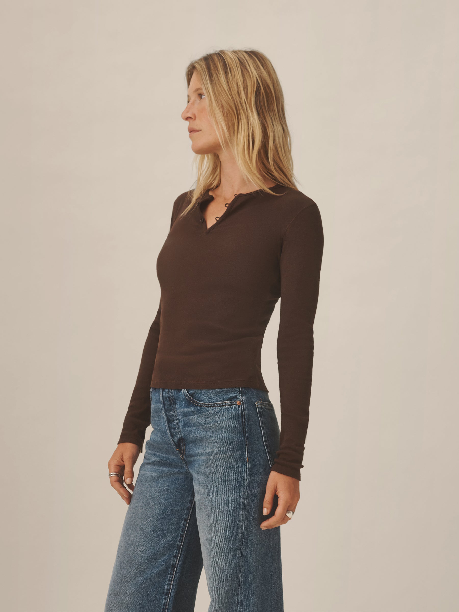 “Slim fit long sleeve henley cut from extra fine 170 GSM cotton with recycled content that holds its shape. Details include a a three-button loop placket with corozo fish eye buttons, and straight, clean finished hem and cuffs. Garment washed for a lived-in feel.
