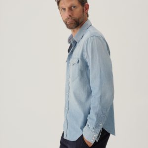 A classic western-style workshirt in a washed cotton chambray. The shirt has all cowboy details like pearl snap closures, curved western yoke, scalloped flap pockets, and three snaps along the cuffs. The blue chambray cotton has been washed for a lived-in feel.
