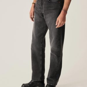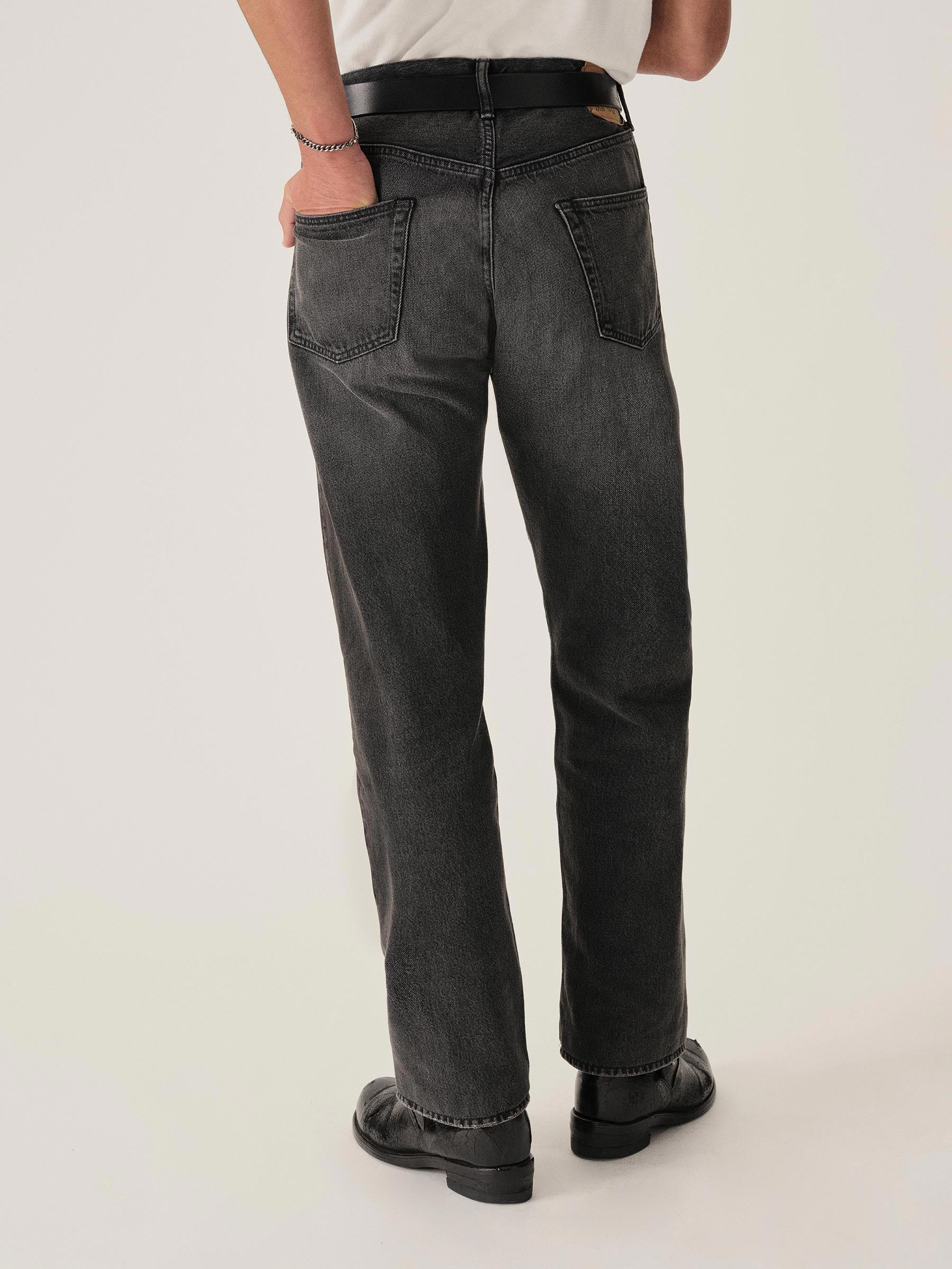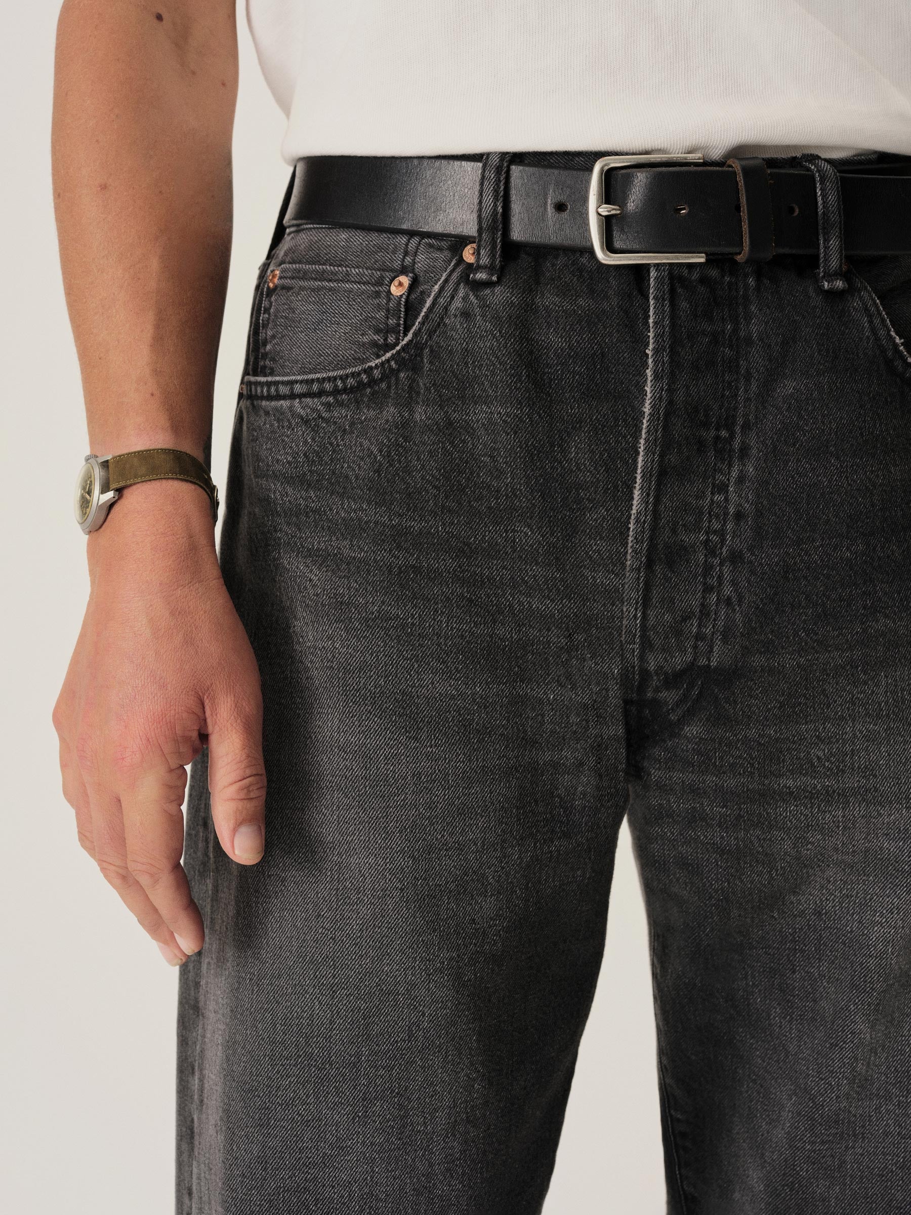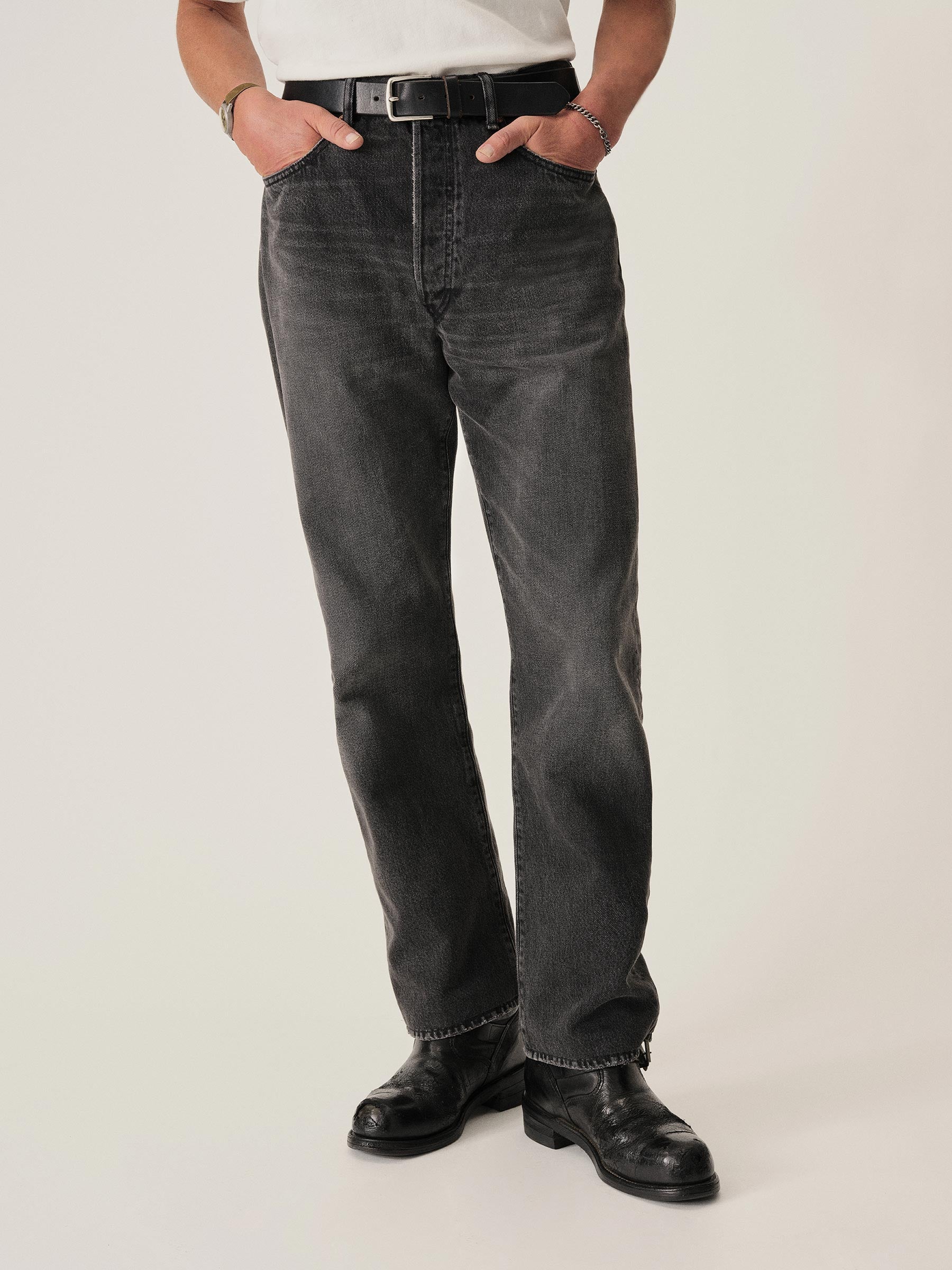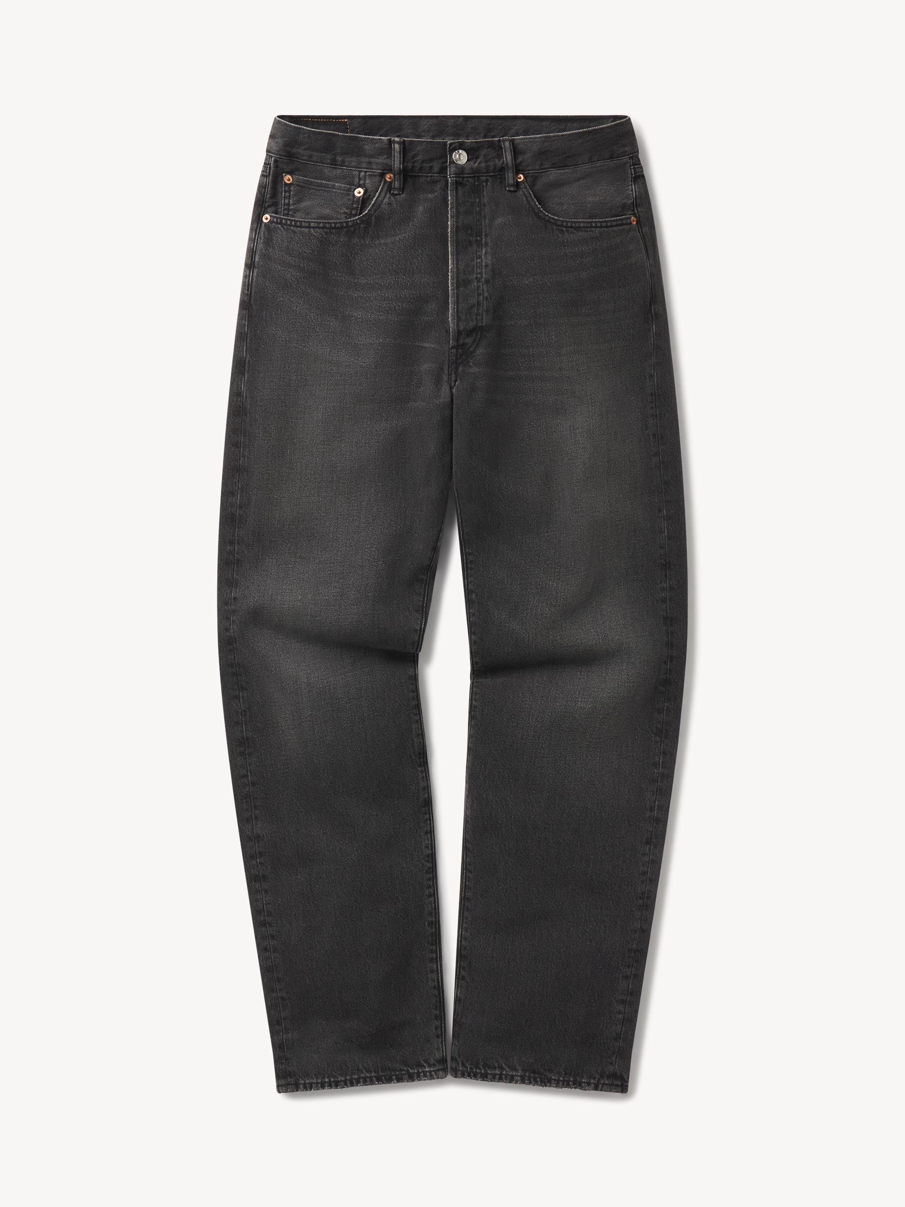 A classic 5-pocket jean in our Full Saddle fit: high-rise with a straight fit through the thigh and leg. This Japanese denim develops more character with every wear. Garment rinsed for a lived-in feel. Details include copper rivets and a metal tack button fly.