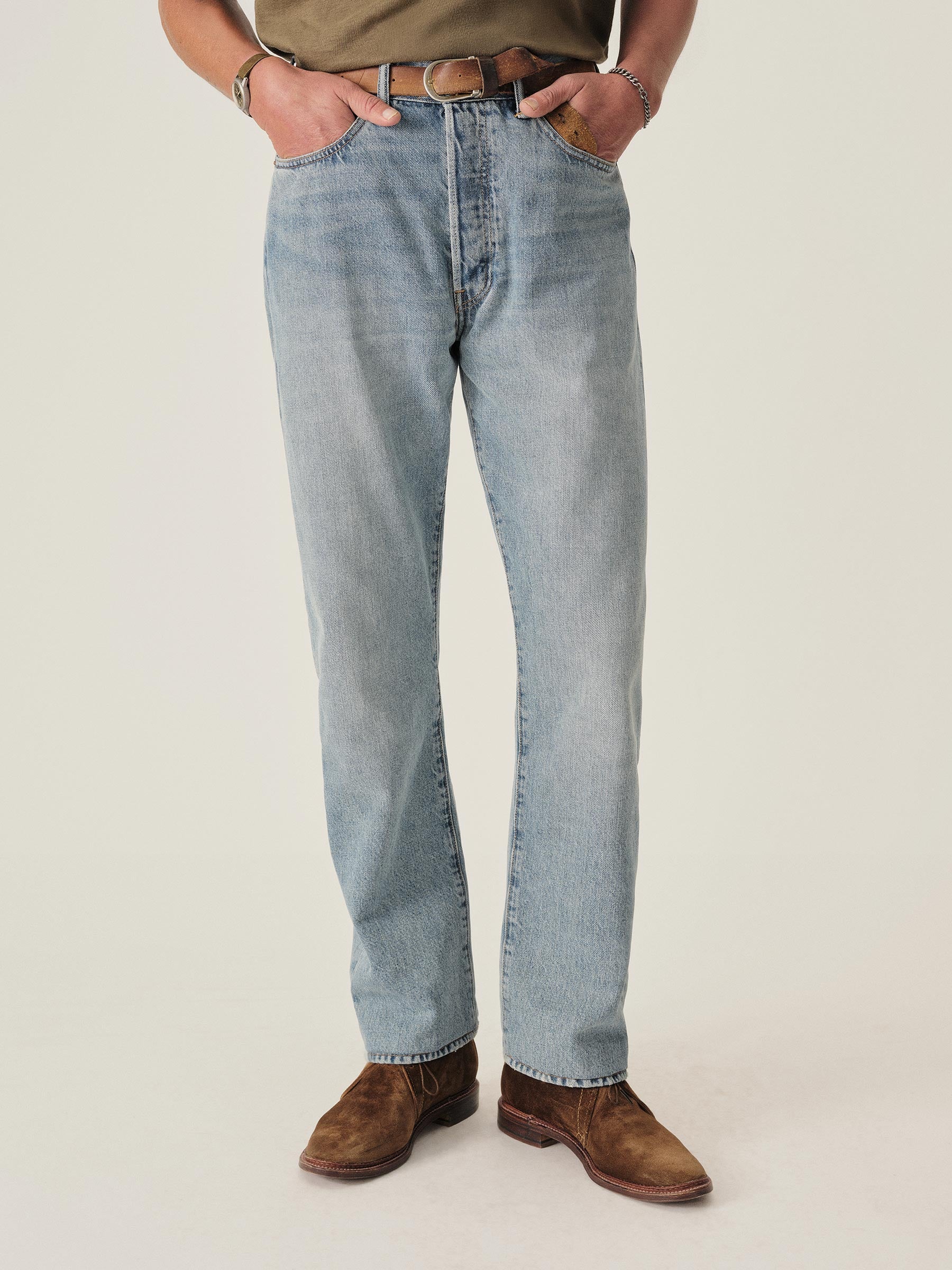 A classic 5-pocket jean in our Full Saddle fit: high-rise with a straight fit through the thigh and leg. This Japanese denim develops more character with every wear. Garment rinsed for a lived-in feel. Details include copper rivets and a metal tack button fly.