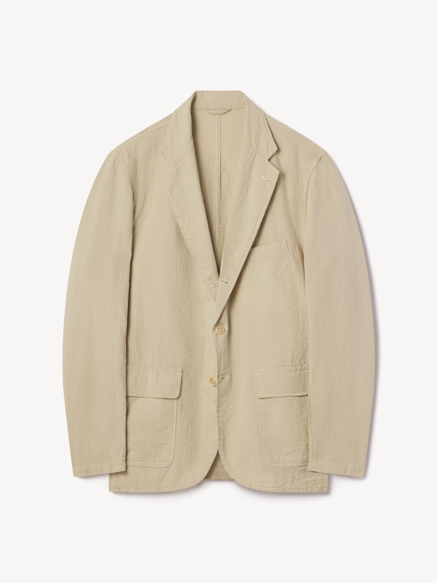 Tailored 3-roll-2 button blazer inspired by timeless vintage suiting. This 5 oz cotton seersucker has a rippled texture that wicks moisture and maintains airflow making it ideal for warmer climates. Details include two patch pockets, two internal welt pockets, and a notched lapel. We left it unlined and omitted the back vent and cuff buttons for a casual, streamlined look. Constructed with hand-linked seams and garment washed with enzymes and softener for a lived-in feel.