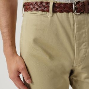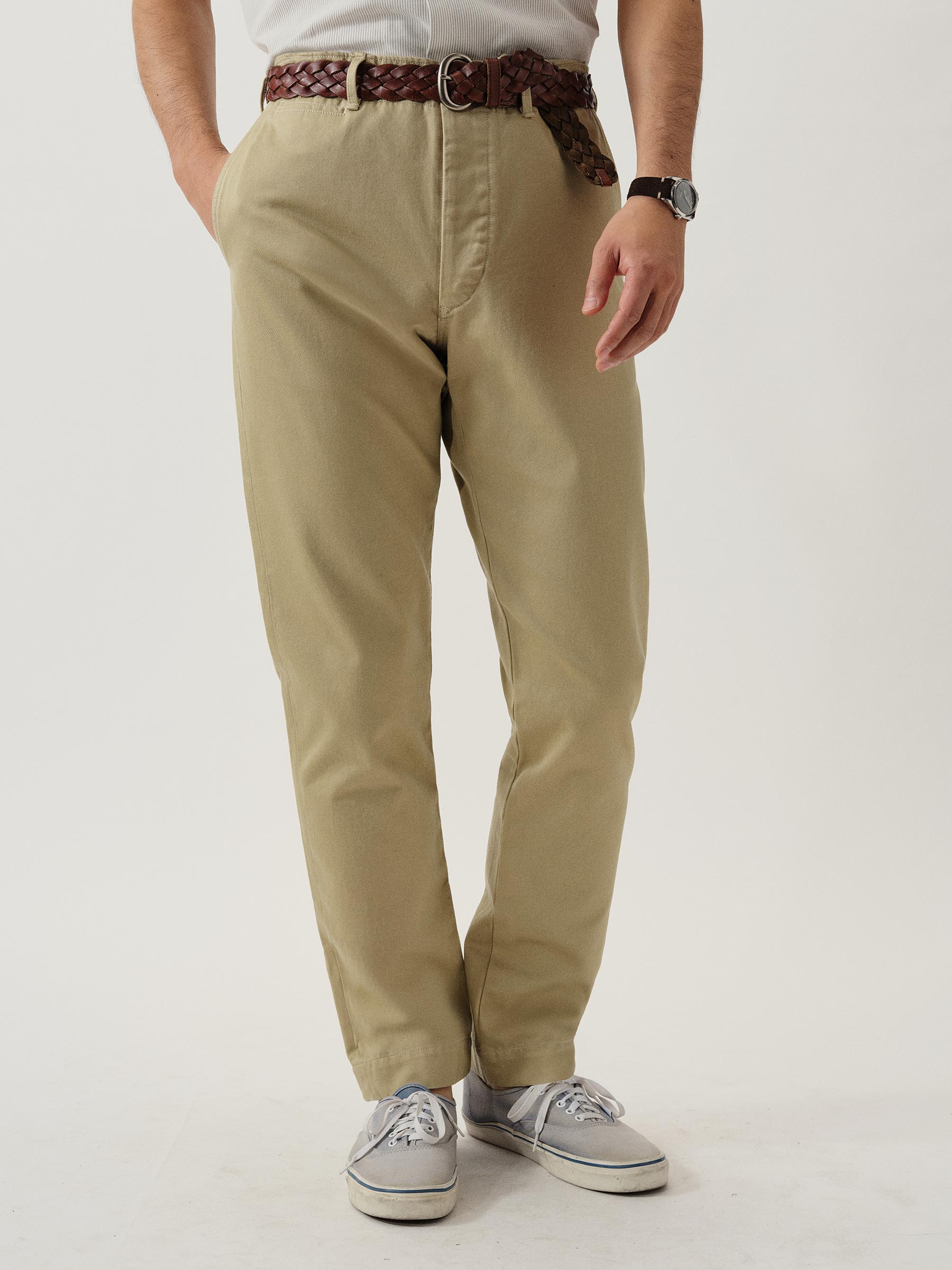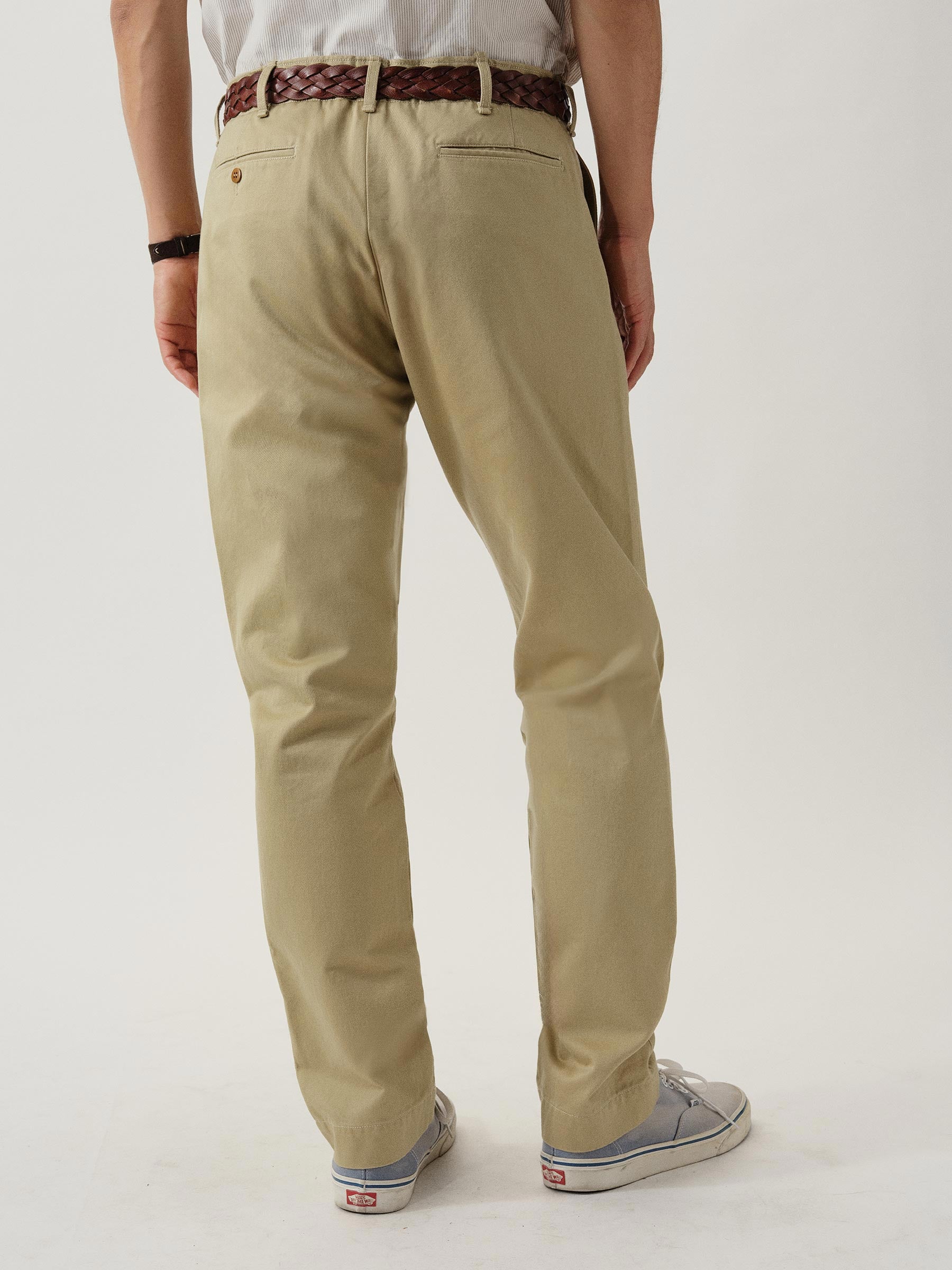 The classic officer’s pant in our Maverick Slim fit: mid-rise, slim through the thighs with a taper below the knee. Cut from 9.5 oz cotton twill that has been washed to achieve the same look and feel of vintage service uniforms. Features a “Hollywood” one-piece waistband construction, slash front pockets, welted back pockets, and a welted coin pocket, natural canvas interior detailing, and real corozo buttons. Garment washed with enzymes for a lived-in feel. Button fly.