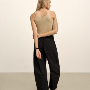 High-rise, military-inspired pant crafted from lightweight cotton poplin with a cropped, 27” inseam and curved barrel legs. Details include two front baker pockets and back patch pockets. Finished with corozo buttons, a zipper fly, and a metal hook and bar with a self-adjusting elastic waistband. Garment-washed for a lived-in feel.