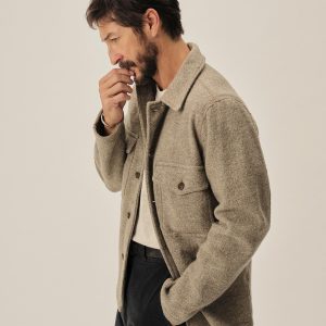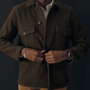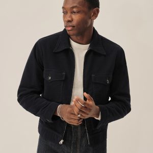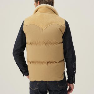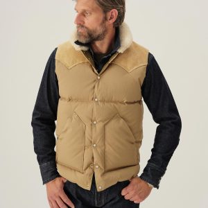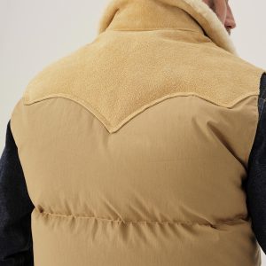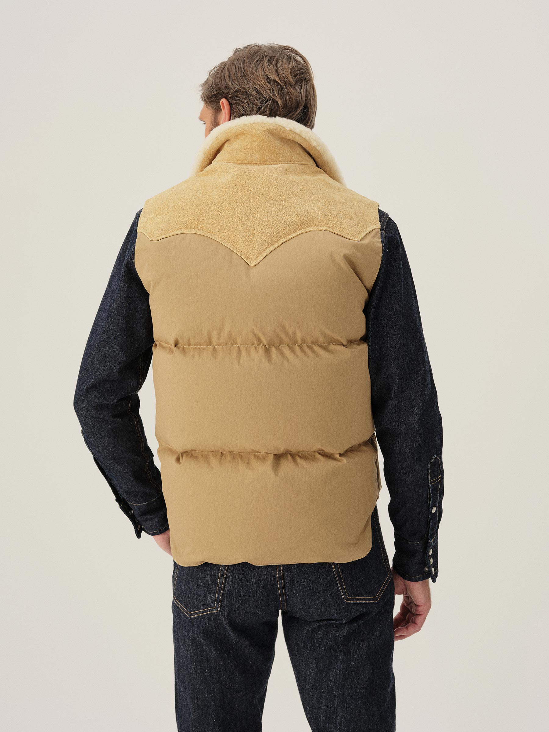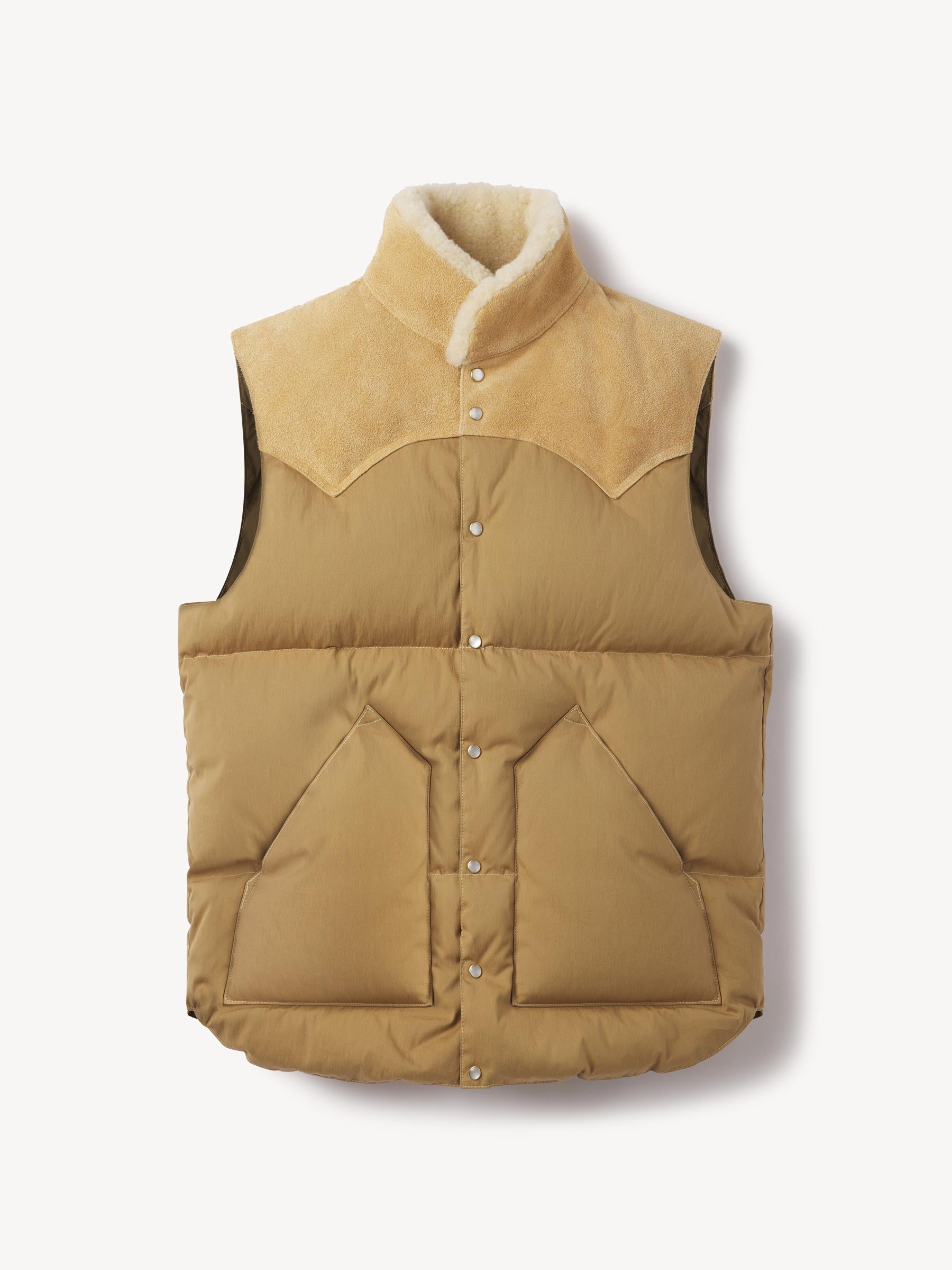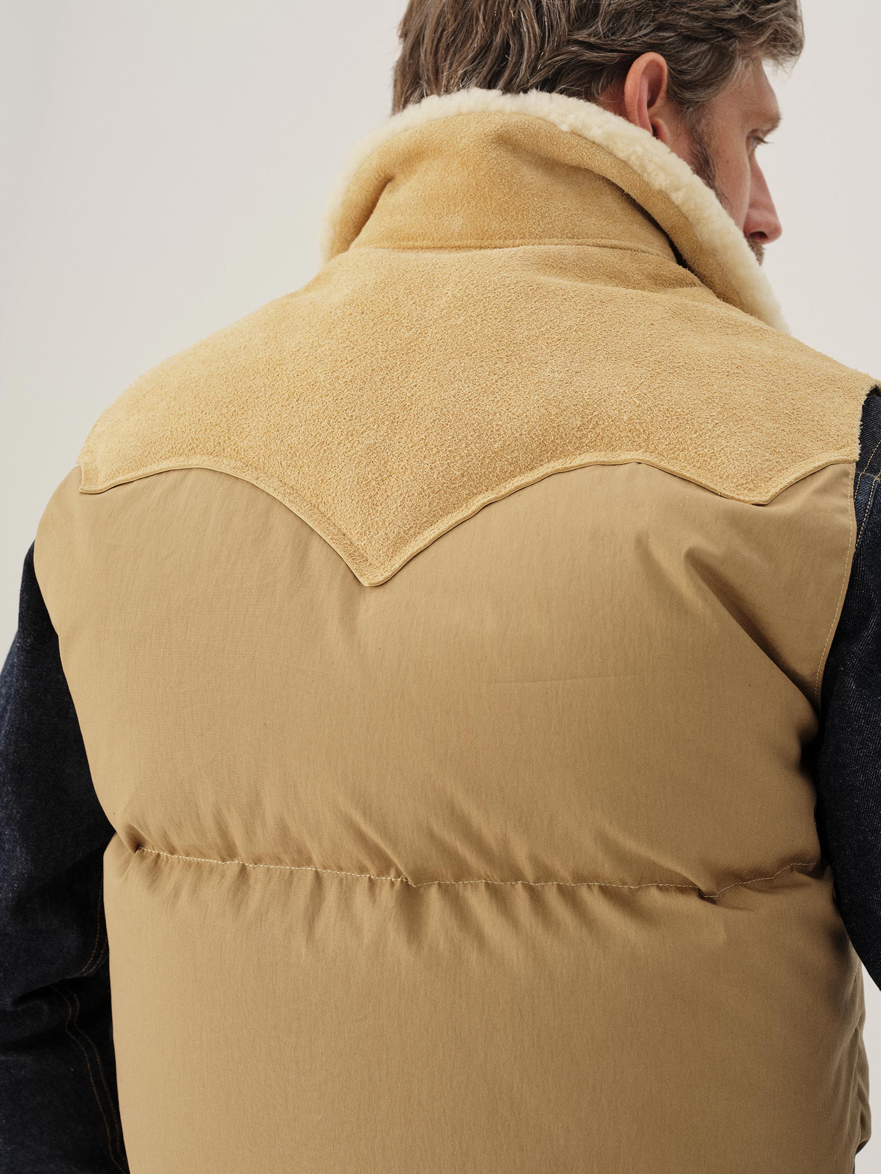 Our collaboration with Rocky Mountain Featherbed delivers vintage inspired updates to the comfort and warmth of their cult famed, western style down fill vest. Constructed from a channel quilted, 65% cotton, 35% nylon poplin with a matte finish, the vintage inspired silhouette is complete with front and back yokes made from a single piece of suede, pearl snaps at the body and sleeves, 2 front hand warmer pockets, an authentic shearling collar, and the addition of a brass chain, Waldes zipper at the interior pocket.