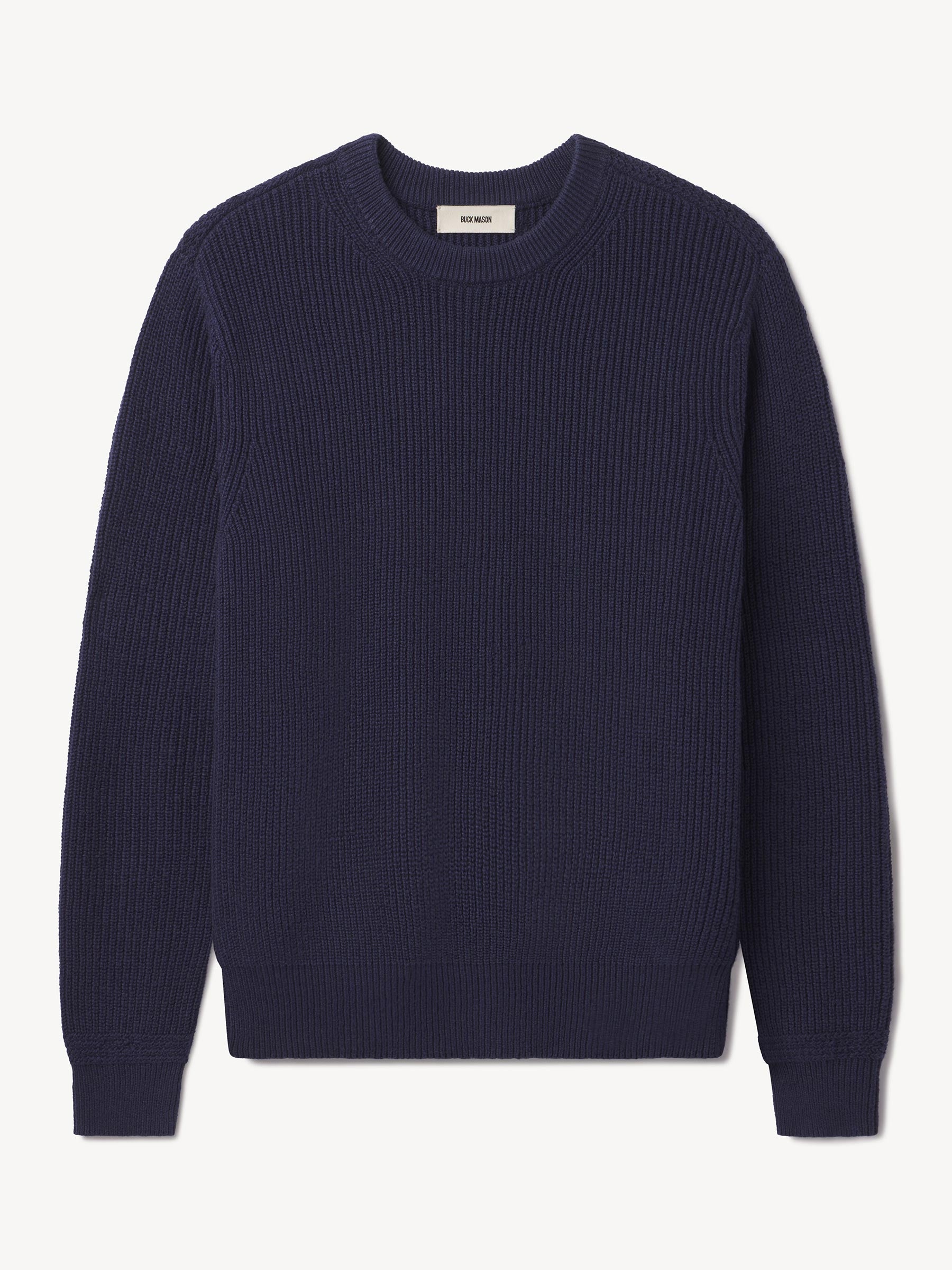 Classic fit crewneck sweater in a homespun textured cotton rib. Constructed with hand-linked seams, double layer ribbing at the collar, and racking stitch detailing at the cuffs.