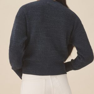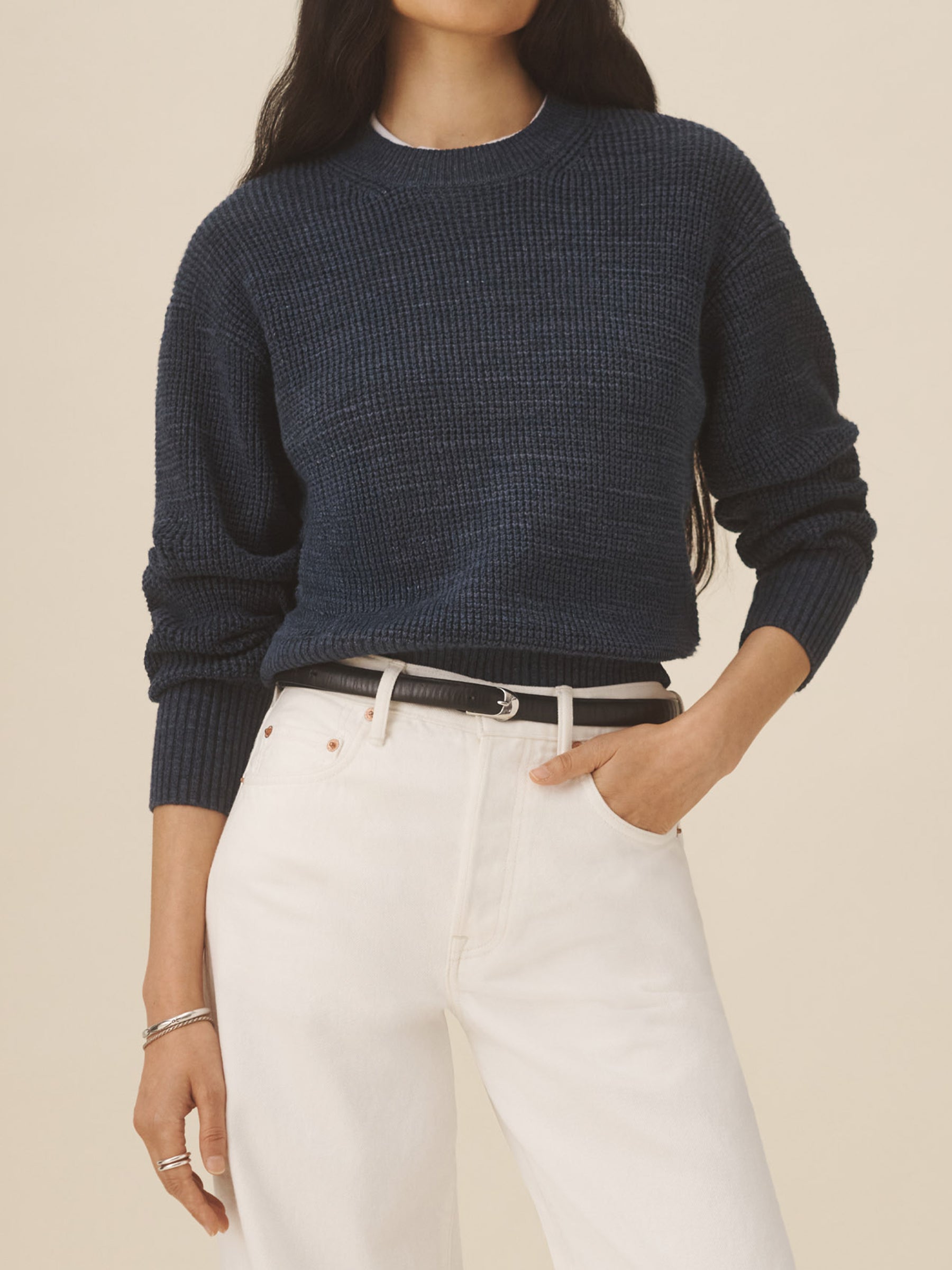 1960s inspired crewneck sweater with an easy, slim fit. Crafted from 7-gauge waffle knit yarn-dyed cotton with a light slub texture, featuring fashioning at the neck and drop-back shoulders as a nod to mid-century.