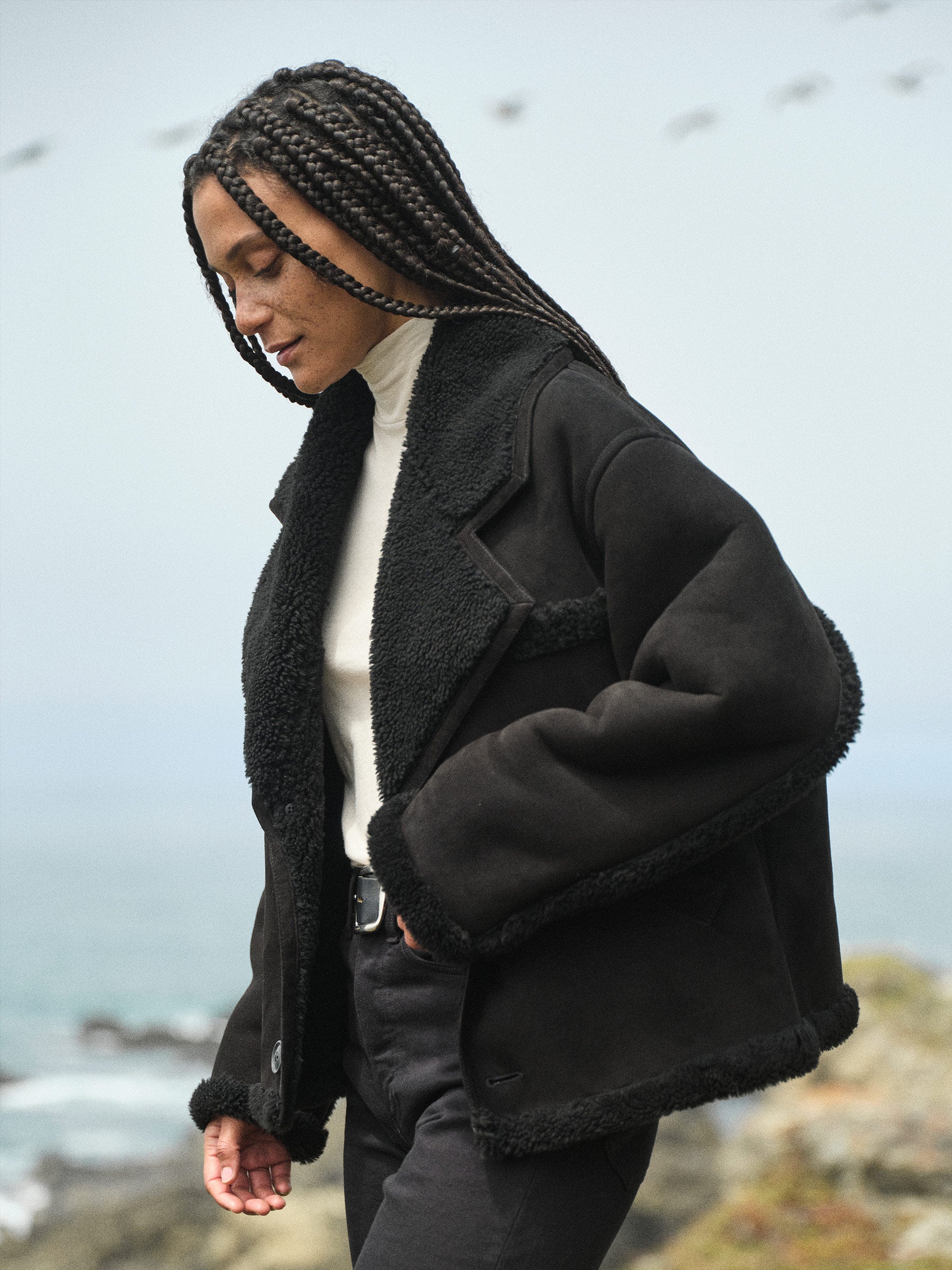 Relaxed shearling jacket in a 25” length. Hand-cut from vegetable tanned lambskin with a suede face and a semi-curl back. Authentic vintage details include easy armholes and sleeves for comfortable layering, horn buttons, and shearling-lined welt pockets. This hide has been vegetable tanned, top dyed, and tumbled for a lived-in look and feel.