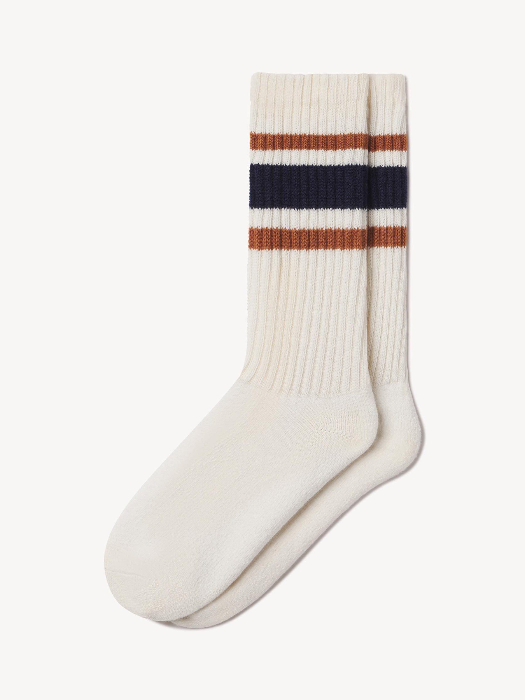 Thick sport socks made in the USA from American-grown cotton. Inspired by—and knit on the same style of machines as—original sport socks from the 80s. Details include a banded stripe and a soft-cushioned terry footbed.