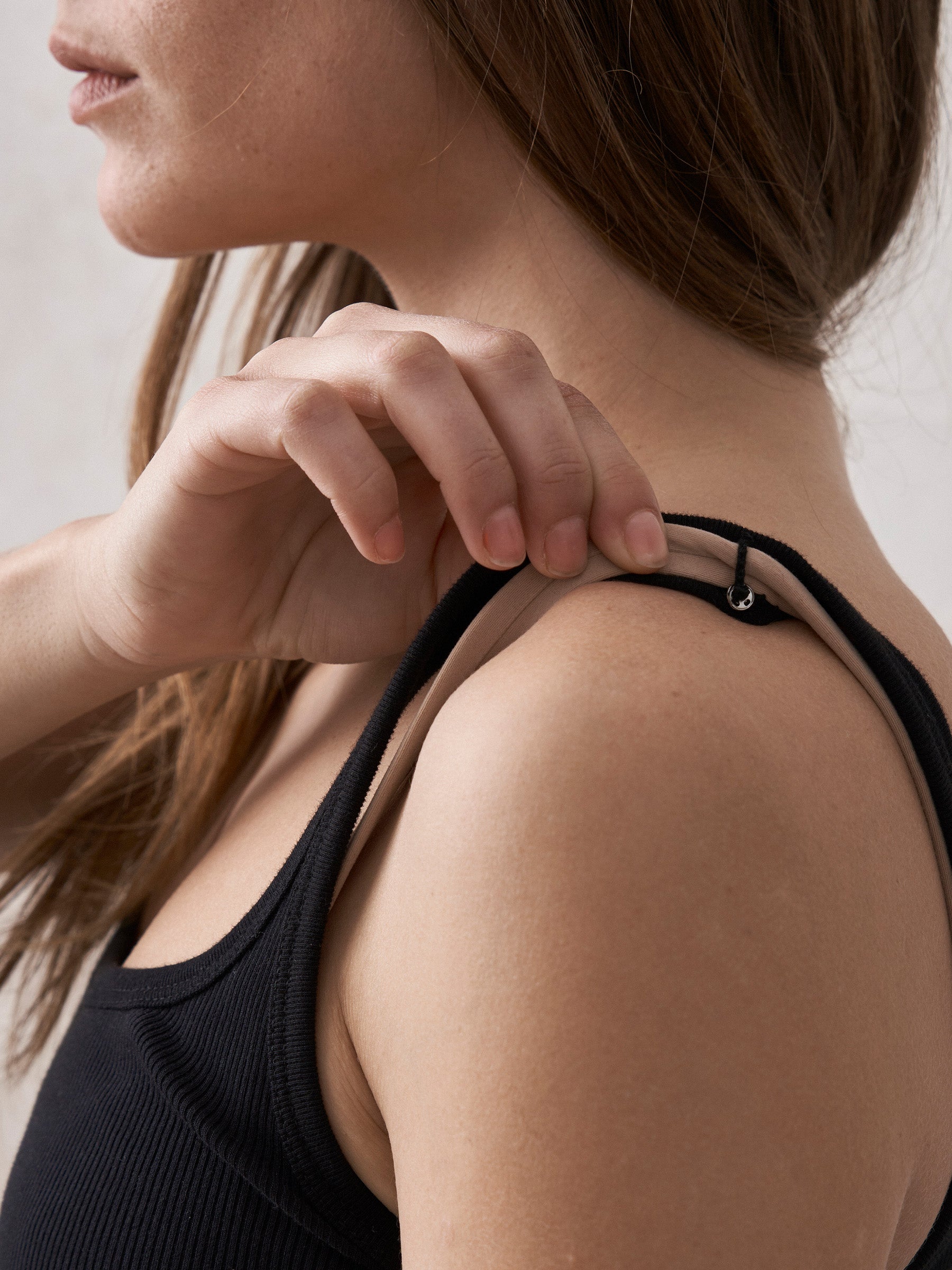 Slim fit ribbed scoop neck tank cut from 295 GSM stretch cotton that holds its shape. 2×2 rib structure—two rows of rib stitch, two rows of jersey stitch—is offset by contrast 1×1 rib at the neck. Constructed with coverstitching throughout and flatlock stitching at the side seams. Garment washed for a lived-in feel.