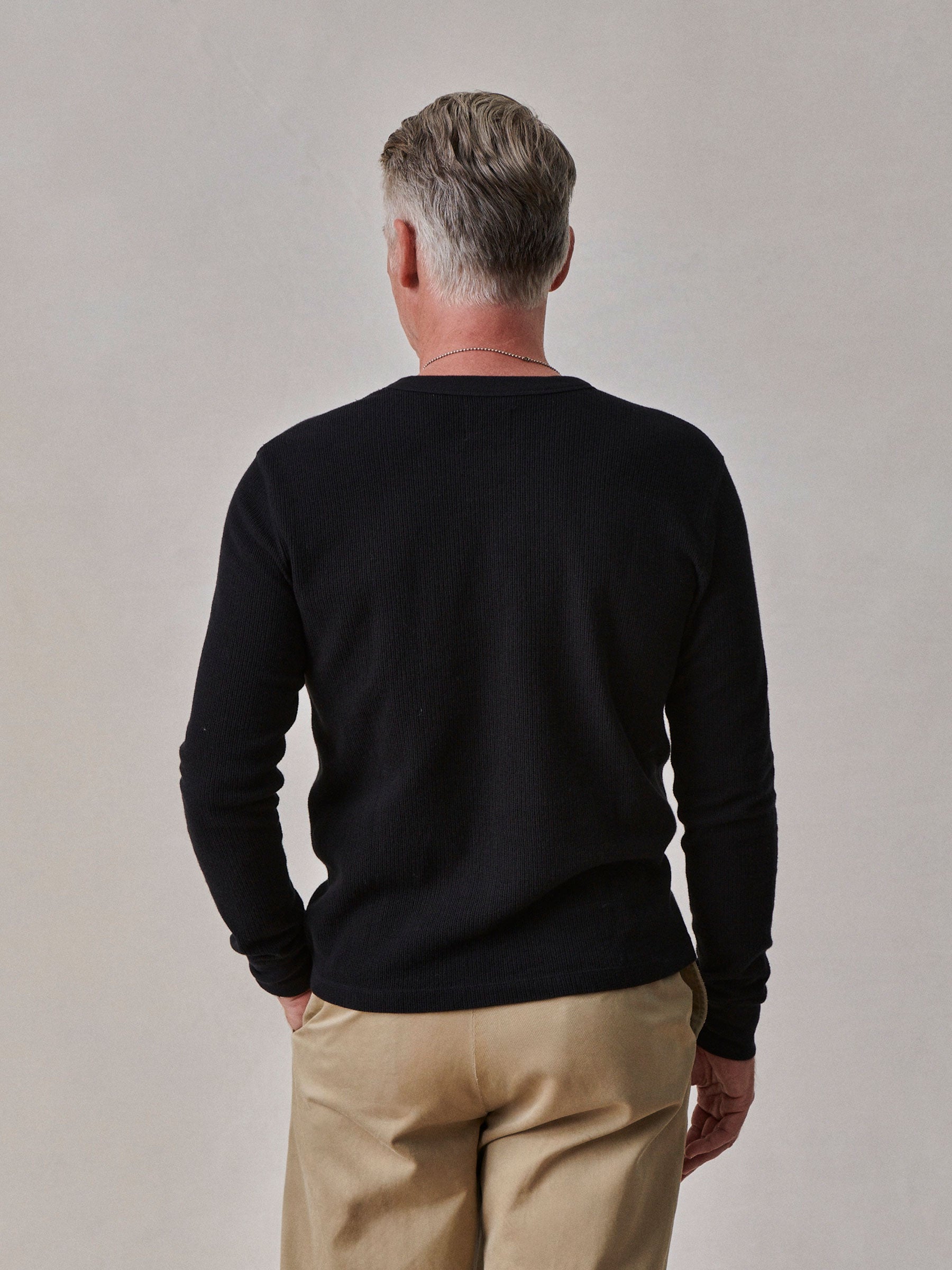 Classic fit thermal long sleeve henley with a straight hem. This 250 GSM French rib cotton double knit features a waffle-knit face and a smooth jersey back. Details include a woven three-button placket and corozo buttons. Constructed with ribbed cuffs and flat-lock stitching throughout for improved comfort and durability. Garment washed with enzymes and softener for a lived-in feel.