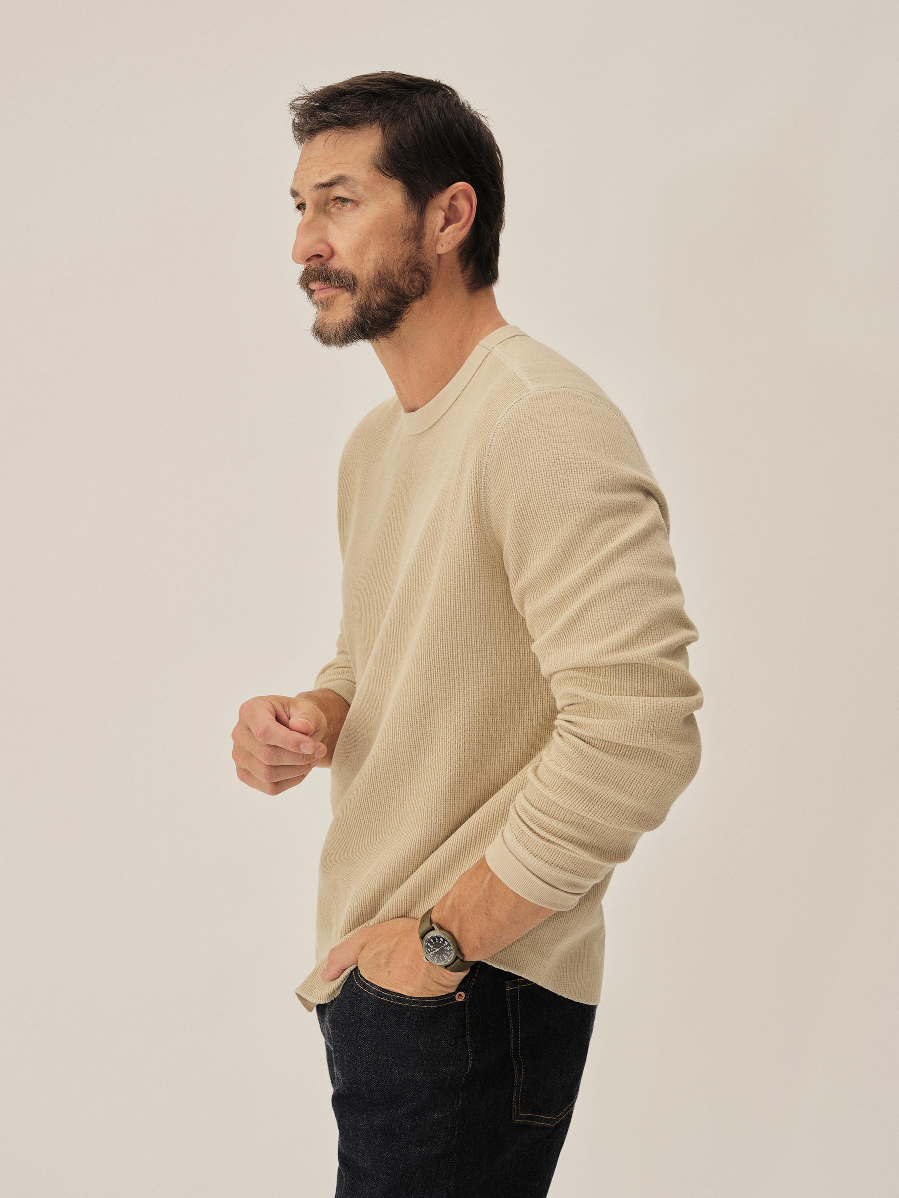 Classic fit thermal long sleeve crewneck tee with our signature curved hem. This 250 GSM French rib cotton double knit features a waffle-knit face and a smooth jersey back. Constructed with ribbed cuffs and flat-lock stitching throughout for improved comfort and durability. Garment washed with enzymes and softener for a lived-in feel.