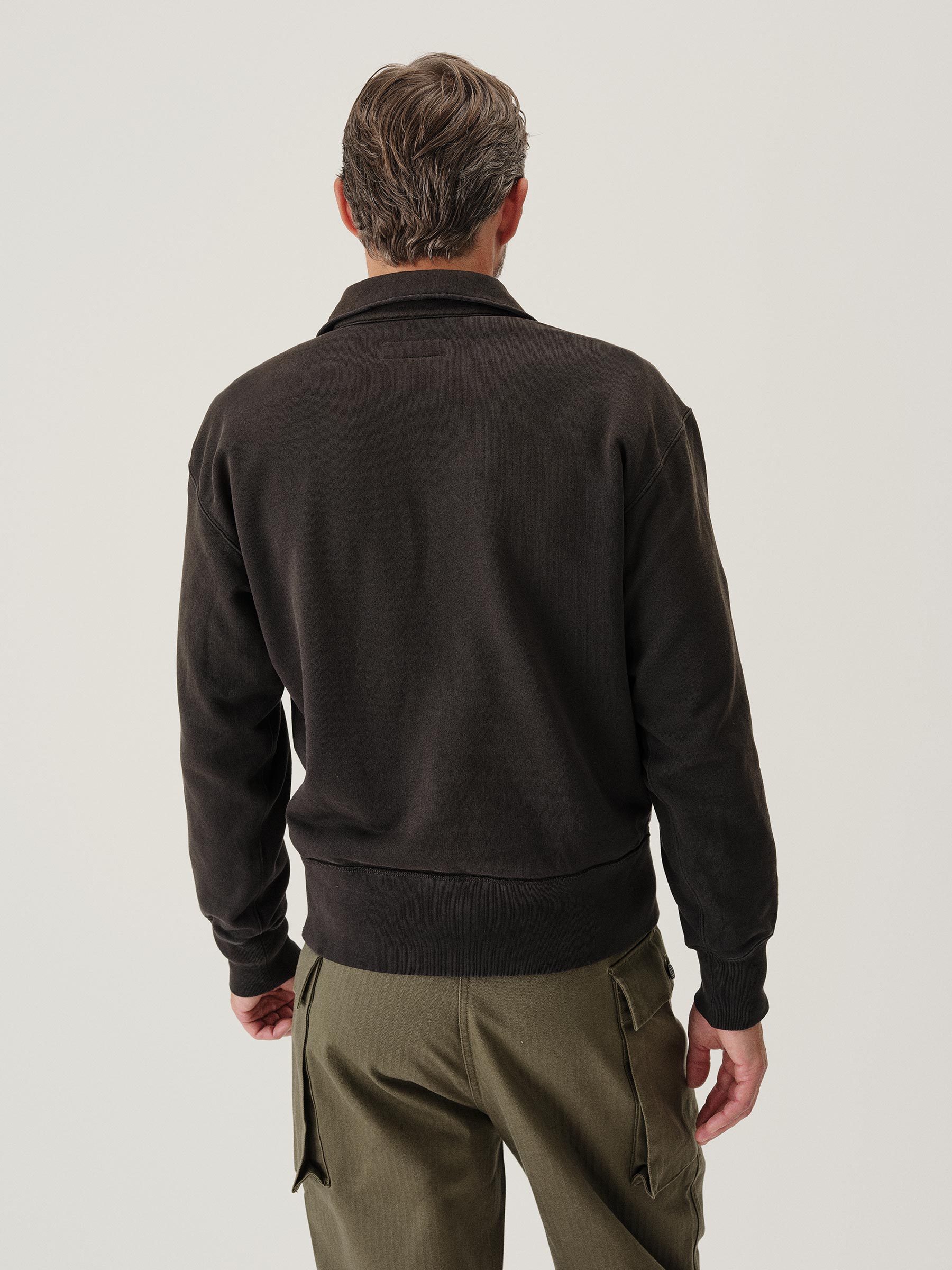 A midcentury-inspired quarter-zip collared sweatshirt made from plush, not-too-heavy, not-too-light, welterweight French terry. Features a foldover collar and front zip closure.