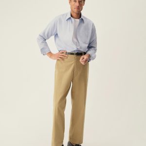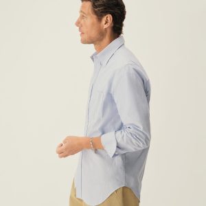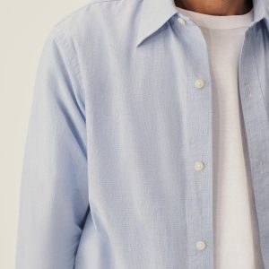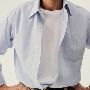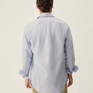 Slim fit long sleeve button-up cut from 4 oz. washed cotton. Details include a button placket, a single spade pocket at the chest, and a box pleat at the back yoke. Constructed with single needle topstitch detailing with double needle stitching at the collar and cuffs.